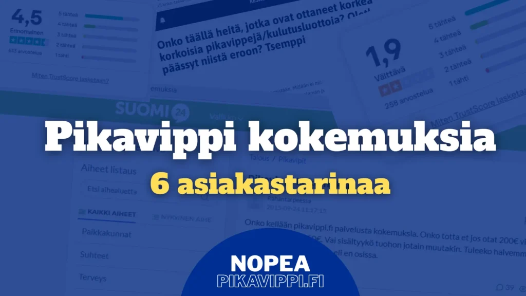 Olemme koonneet tälle sivulle pikavippi kokemuksia 6 asiakastarinan muodossa. Vaikka Nopea-pikavippi.fi mainostaa turvallisia pikavippejä, ei kritiikiltäkään vältytä – näin me pidämme toimintamme mahdollisimman läpinäkyvänä ja reiluna.